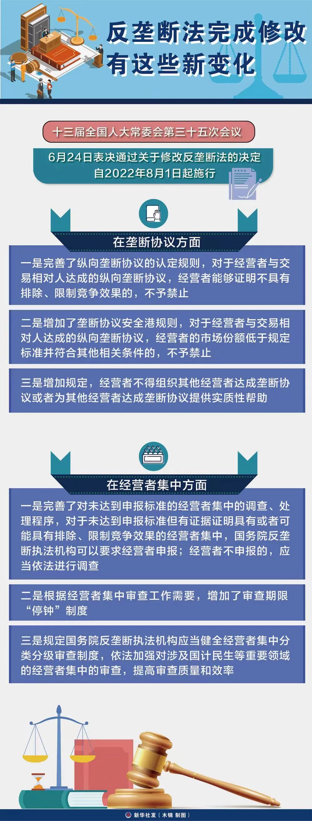 十三届全国人大常委会第三十五次会议6月24日表决通过关于修改反垄断法的决定,自2022年8月1日起施行。这是反垄断法自2008年实施以来的首次修改,旨在维护公平竞争秩序,健全统一、开放、竞争、有序的市场体系。