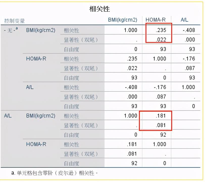 由下表可知,结果分为上下两部分,上面部分是没有控制AL的情况下,三个变量间的两两相关性矩阵,可以发现BMI与HOMA-R指数之间相关系数为0.235(p=0.022<0.05),存在一定的相关;下半部分为 在扣除了AL值影响后,BMI与HOMA-R指数之间偏相关系数为0.181(p>0.05),故不能认为二者有线性相关关系。4. 语法: