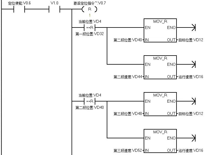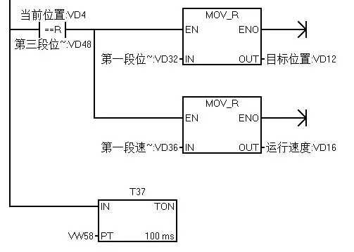 当当前位置和第一段A点位置相等时,把B点位置和速递传送至目标值地址内,延时一定时间后,运行至B点,当到达B点后把C点的位置和速度传送至目标位置地址