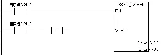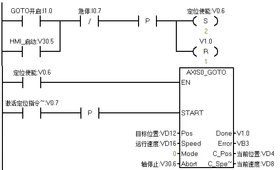 最后是自动部分的程序,当没有急停的情况下,按下启动按钮后,则开始执行GOTO指令,开始运行依第一段速度运行至第一段位置