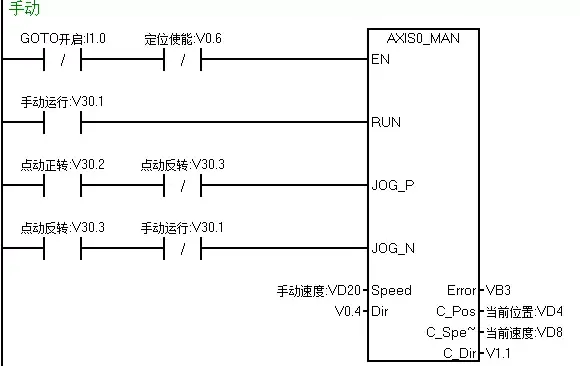 其次我们接着编写手动部分的程序,手动运行正反转时需要互锁,并且在自动模式时手动模式不能运行,所以用定位使能及自动运行两个条做手动程序的EN位