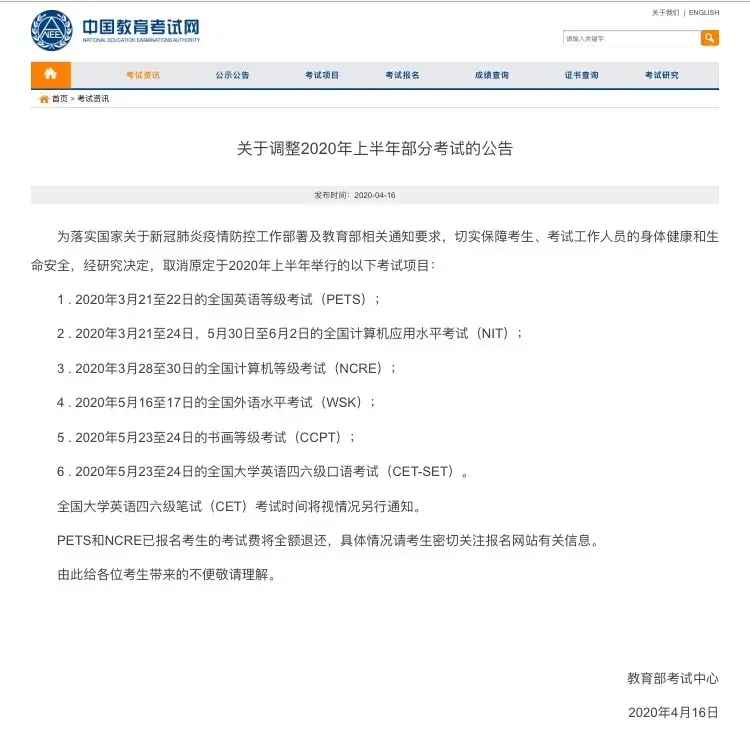 4月16日,教育部考试中心官方网站中国教育考试网发布了《关于调整2020年上半年部分考试的公告》。内容如下: