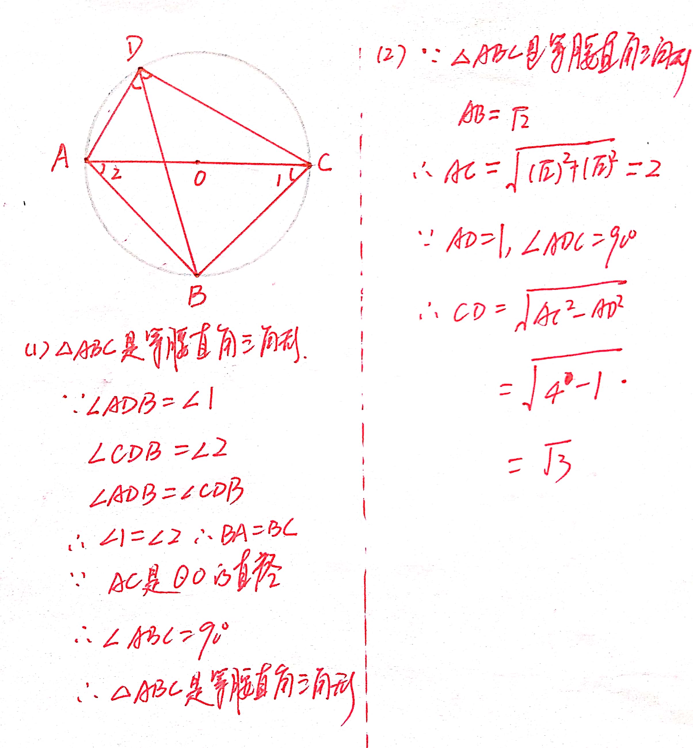 思路分析:第(1)问,可以猜测正确结果——△ABC是等腰直角三角形。因为AC是⊙O的直径,所以∠ABC=90,又因为∠ADB=∠CDB,利用“同弧所对的圆周角相等”,可得∠CAB=∠ACB,所以BA=BC,问题解决;第(2)问,在等腰直角三角形ABC中,AB=,利用勾股定理可求AC=2,AC为⊙O的直径,所以∠ADC=90°,AD=1,由勾股定理可求出CD的长度.