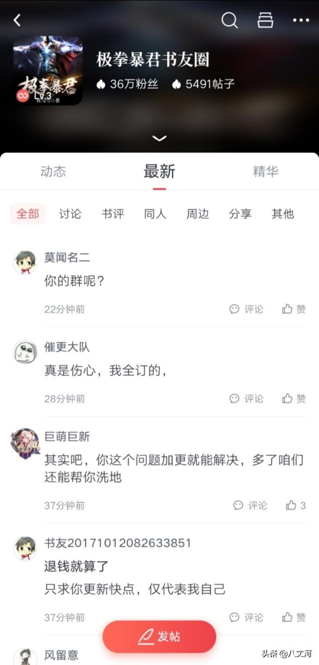 关键是我看完作者道歉章节后在书评区写了几句感言,很平和陈述事实,鼓励作者多更新,然后过一会就发现帖子不见了,再然后就是被禁言了,永久禁言,应该是和作者骚操作相关的帖子全部删除禁言,因为之前看到的讨论帖子都没了,很优秀!