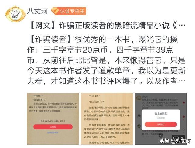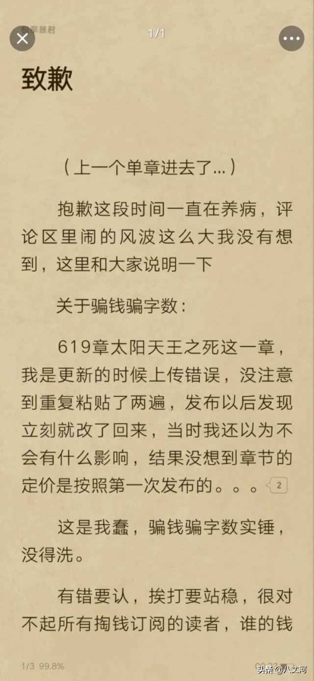 三千字章节20点币,四千字章节39点币,贵了近一倍!从前往后比比皆是,本来懒得管它,只是今天这本书作者发了道歉单章,我以为是更新去看,才知道这本书书评区爆了。