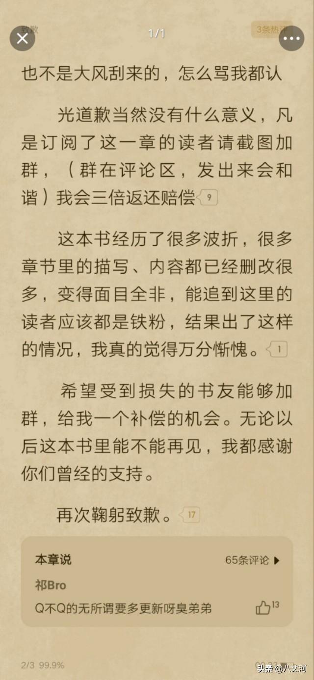 至于道歉单章里所说退一章的钱,首先这个作者只承认一章,其次他不发书友群群号,说是发出会被屏蔽,最后他很快删除道歉单章,毕竟两百万字的书从前往后那么多诈骗章节,他哪敢都承认,退钱也不能弥补他长期欺诈正版付费读者的过错,更何况他也不可能都退钱,毕竟钻进钱眼里了。【据说他上本书也有相关操作,毕竟是长期惯犯,话说这应该是违法的!】