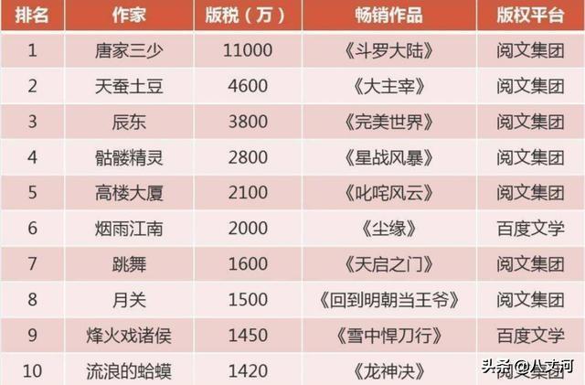 而之前统计网络小说作家数量已超过1200万,阅文集团就有760万作家,这么大的基数自然而然会诞生一大批行业富豪,比如金字塔顶尖的唐家三少,天蚕土豆,我吃西红柿,辰东等都是版权费上千万过亿的亿万富翁!