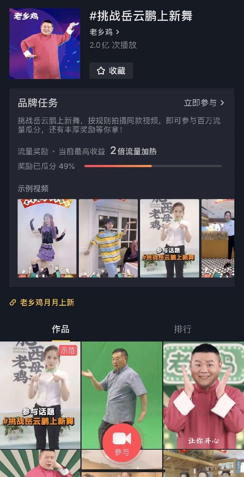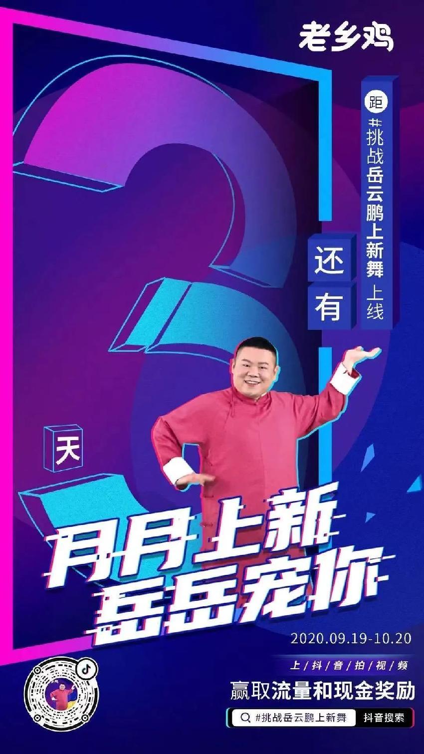 抖音#挑战岳云鹏上新舞#的活动主题是“月月上新,岳岳宠你”,实际上是岳云鹏代言老乡鸡的事件延续,挑战的舞蹈正是岳云鹏代言老乡鸡TVC中岳云鹏身穿红色长袍魔性尬舞的部分。