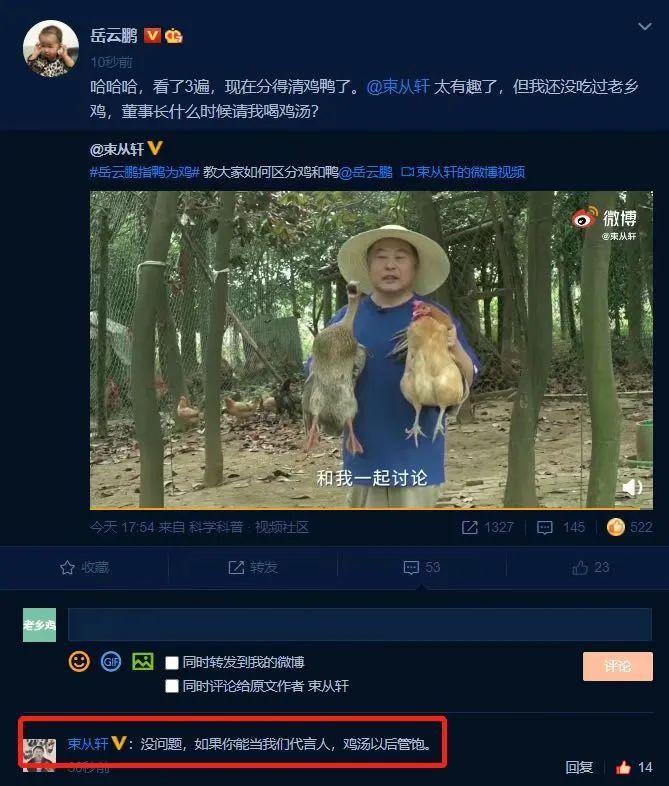 8月24日-8月25日晚间, @岳云鹏亲自下场与束从轩开始了看似充满火药味,实则暧昧不清的CP互动。你说我的相声,我就炖你的鸡汤,#岳云鹏指鸭为鸡#的一张“鸡(yā)汤图”先上热搜;随后,束从轩“划水摸鱼”,鸡场录制视频教岳云鹏分辨鸡鸭;岳云鹏再发微博,以哈哈哈回应被教训的尴尬,并@束从轩要碰瓷喝老乡鸡的鸡汤;束从轩反将一军,微博回复岳云鹏称“如果你能当我们代言人,鸡汤以后管饱”。