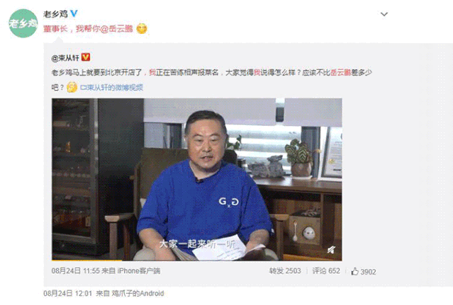 8月24日,老乡鸡董事长@束从轩微博宣布即将进驻北京,为投北京食客所好,以老乡鸡经典菜品串成相声贯口“报菜名”,一口流利不普通的合普(合肥普通话),竟cue相声演员岳云鹏,称“应该不比岳云鹏差多少吧?”