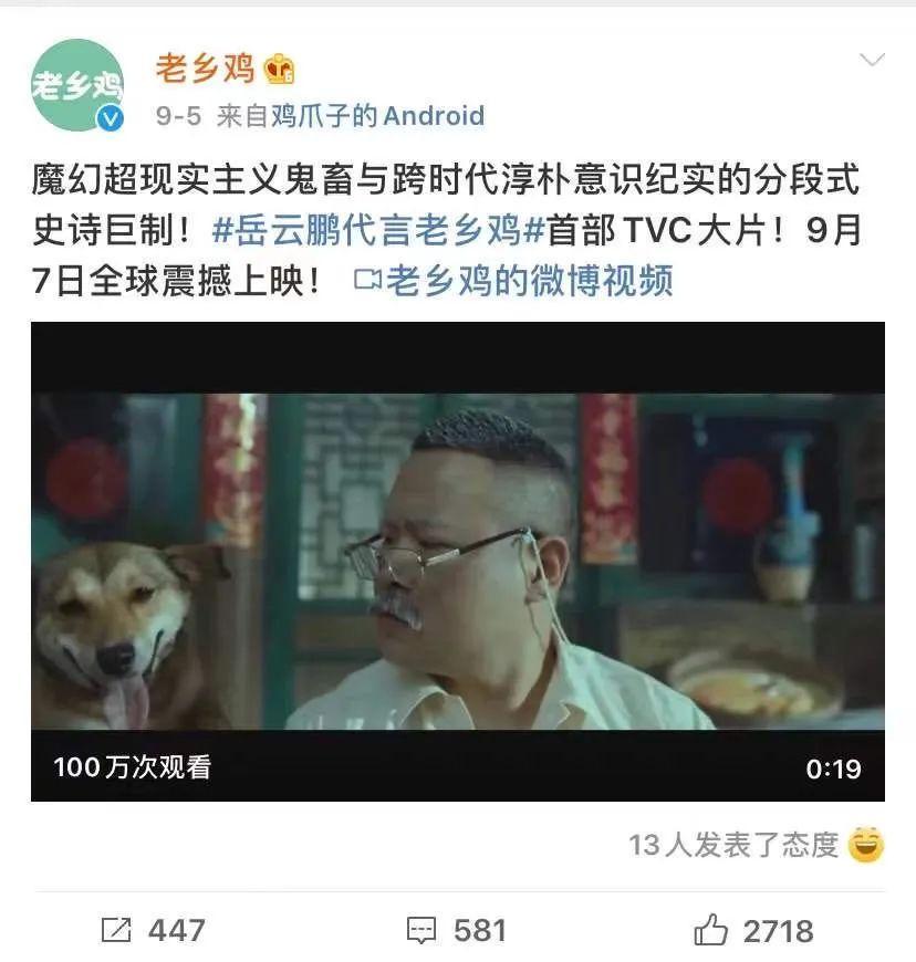 原该尘埃落定的品牌代言事件,竟还远远没有结束。9月5日和7日,@老乡鸡分别发布岳云鹏代言老乡鸡首部TVC预告片和正片,称其为“魔幻超现实主义鬼畜与跨时代淳朴意识纪实的分段式史诗巨制!”