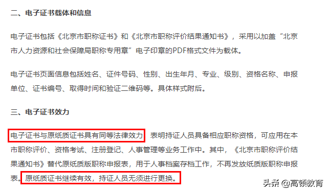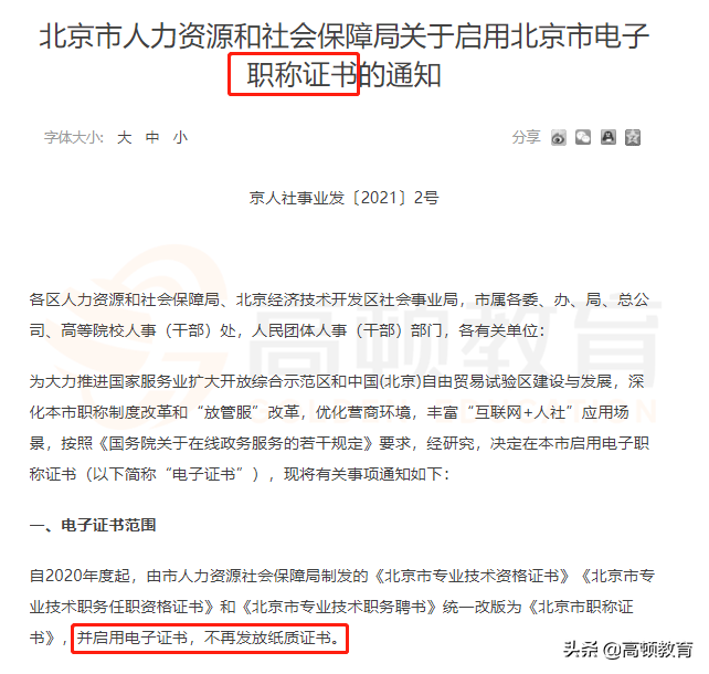 2021年2月2日,高顿CPA小编注意到,北京是人社局发布了一份关于启用电子职称证书的通知,详细内容如下: