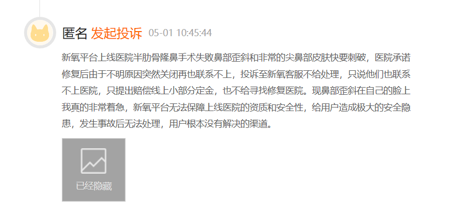 今年315凤凰财经发起的调查显示,新氧和更美是消费者维权的关注焦点,尤其是新氧医美得票数高达137377票,占比34.46%。在新浪旗下黑猫投诉,时常有控诉通过新氧平台手术失败的消费者。