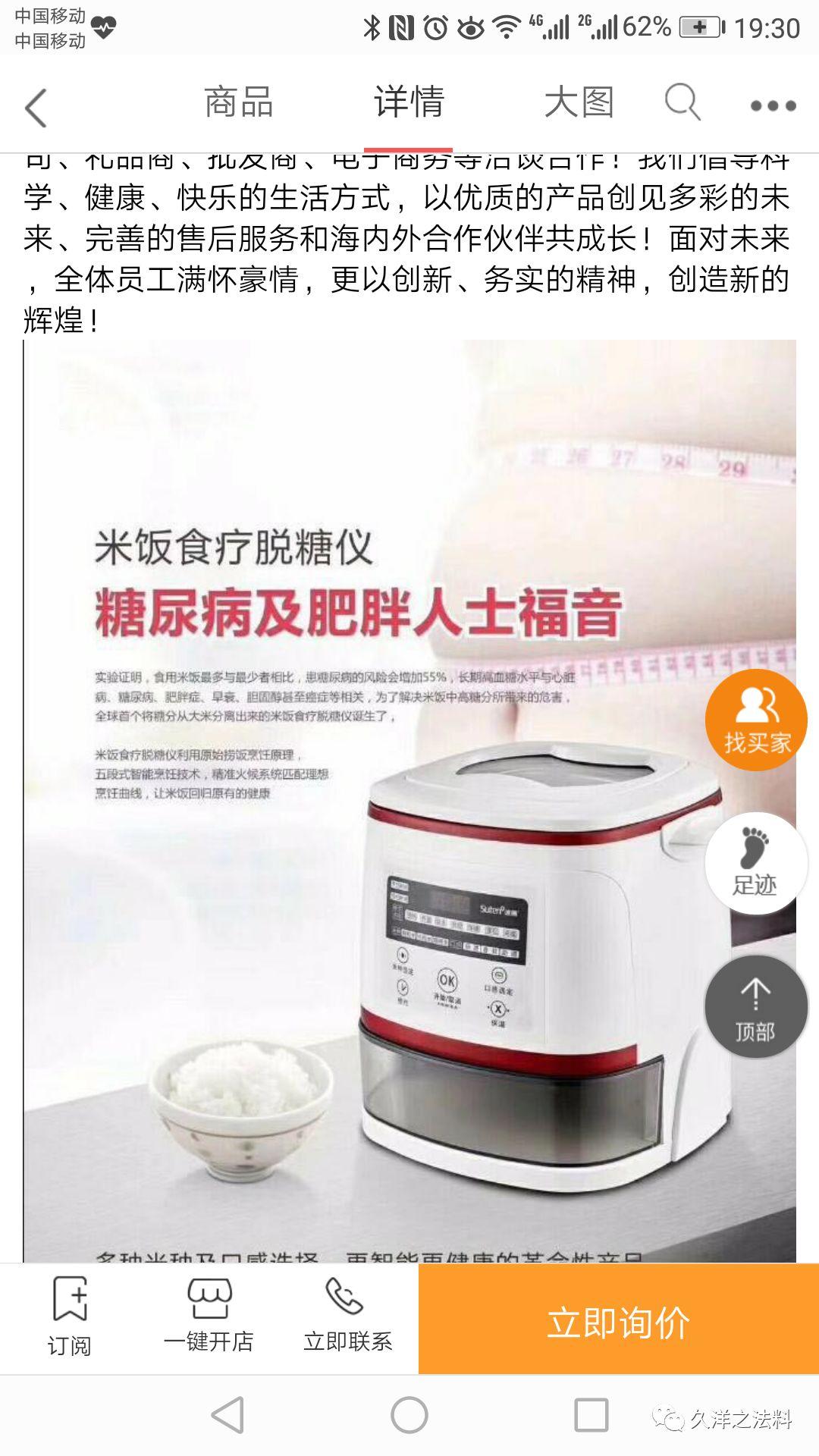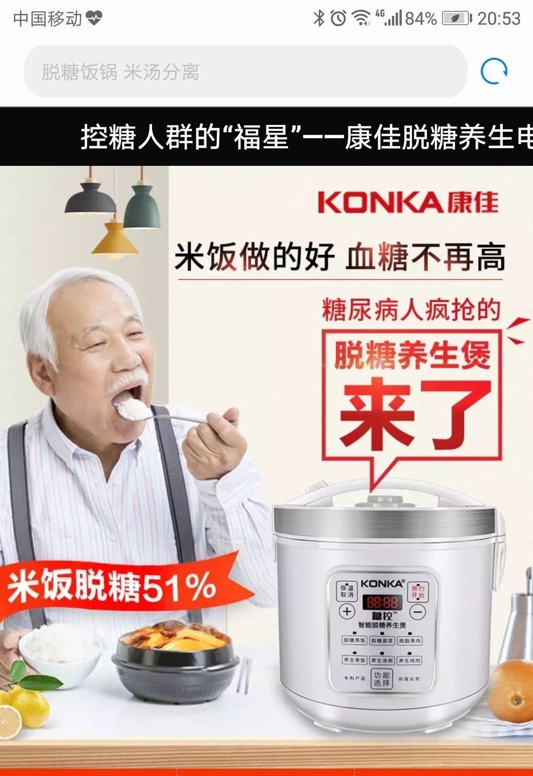 电饭煲,本跟医疗器械没有关系,通常情况也不会发生消费者误认为有疾病治疗功能的。但该则电商网页中,大量使用了“控糖人群的福星”“糖尿病人疯抢的脱糖养生煲来了”“米饭脱糖51%”“米饭食疗脱糖仪”“糖尿病及肥胖人士福音”等用语,容易使人产生该型号电饭煲可以帮助控制血糖的误解,而控制饮食、控制血糖则是糖尿病患者平时很重要的疗养措施。疗养本就是慢性病人的一种重要治疗方式,“三分治七分养”也是中医的一个重要的理念观点。本幅电商网页的宣传显然会误导糖尿病人,如其信以为真,就可能错失血糖控制机会,造成病情恶化。这幅电商网页也是触犯《广告法》第十七条规定的。