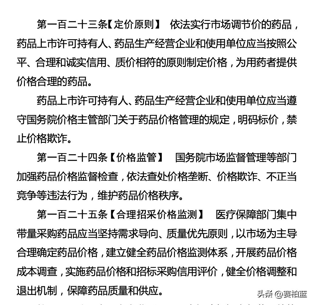 今年5月,国家药监局发布的《中华人民共和国药品管理法实施条例(修订草案征求意见稿)》第123至125条提到的“定价原则”、“价格监管”、“合理招采价格监测”中明确,“建立健全药品价格监测体系,开展药品价格成本调查,实施药品价格和招采信用评价,健全价格调整和退出机制,保障药品质量和供应。”