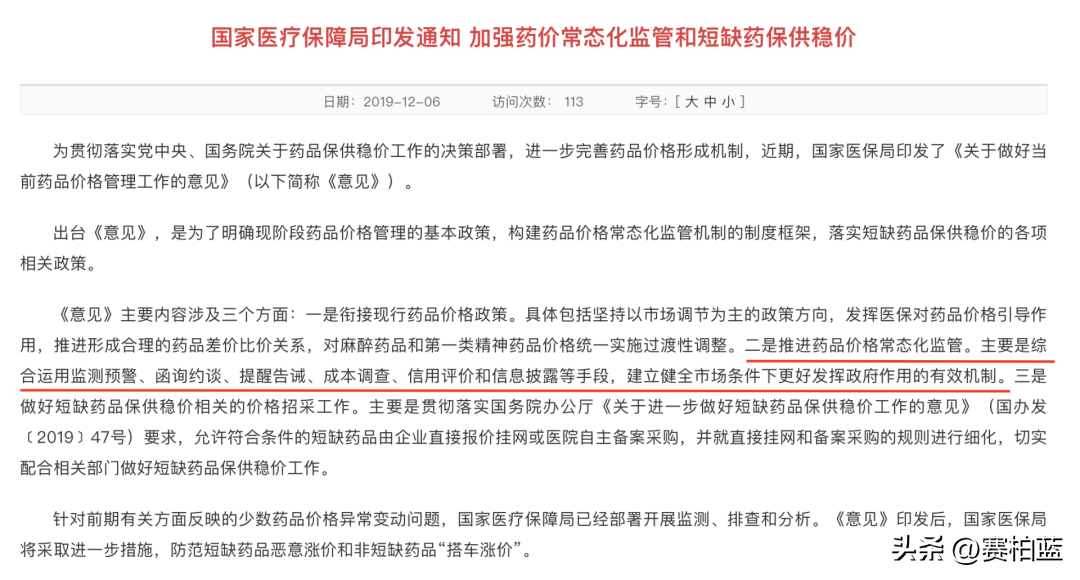 例如,2019年12月,国家医保局发布的《关于做好当前药品价格管理工作的意见》中,要完善药品价格成本调查工作机制。