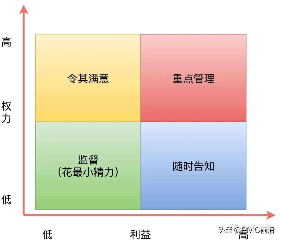 低利益高权利,比如财务,项目的成功与否跟他们没有关系,但是如果你项目中需要用到钱,可能必须要经过他们的审批,我们必须要重点关注,一不小心可能会由于预算批不下来导致项目delay;