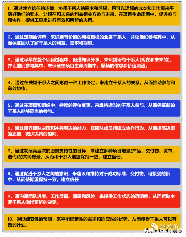 项目经理是个情商智商都需要在线的工作,面对大项目,千头万绪,怎么来管,需要智商在线,面对这么多人,怎么沟通,情商需要在线。尤其是沟通的管理,希望这篇相关方管理的文章以及里面的案例都能够给大家一些启发。