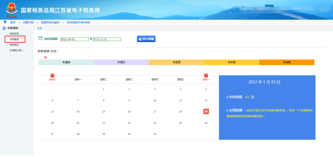 01登录电子税务局,点击“我要办税——税费申报及缴纳——财务报表月(季)申报——申报缴纳——涉税查询”