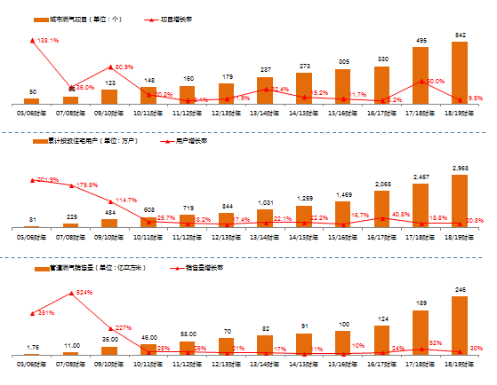 整体上都处在一个逐渐上涨的过程中,业务表现不错,但增速开始趋缓。18/19财年燃气城市项目和燃气销售量增长率有所下滑,但用户量增速则持续上扬,应该是用户渗透率再提升。