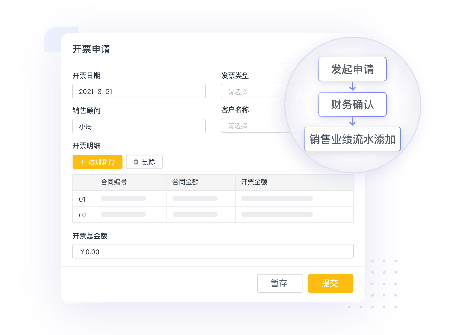 当进入到交易阶段,会涉及与行政财务的跨部门合作以及从合同管理到收款的全流程管理。通过轻流CRM系统线上发起合同管理,跨部门自动流转合同审批,再记录金额、收款日期等信息,完成后自动添加至销售业绩。自动化流程减少行政事务消耗时间,让销售更专注客户。