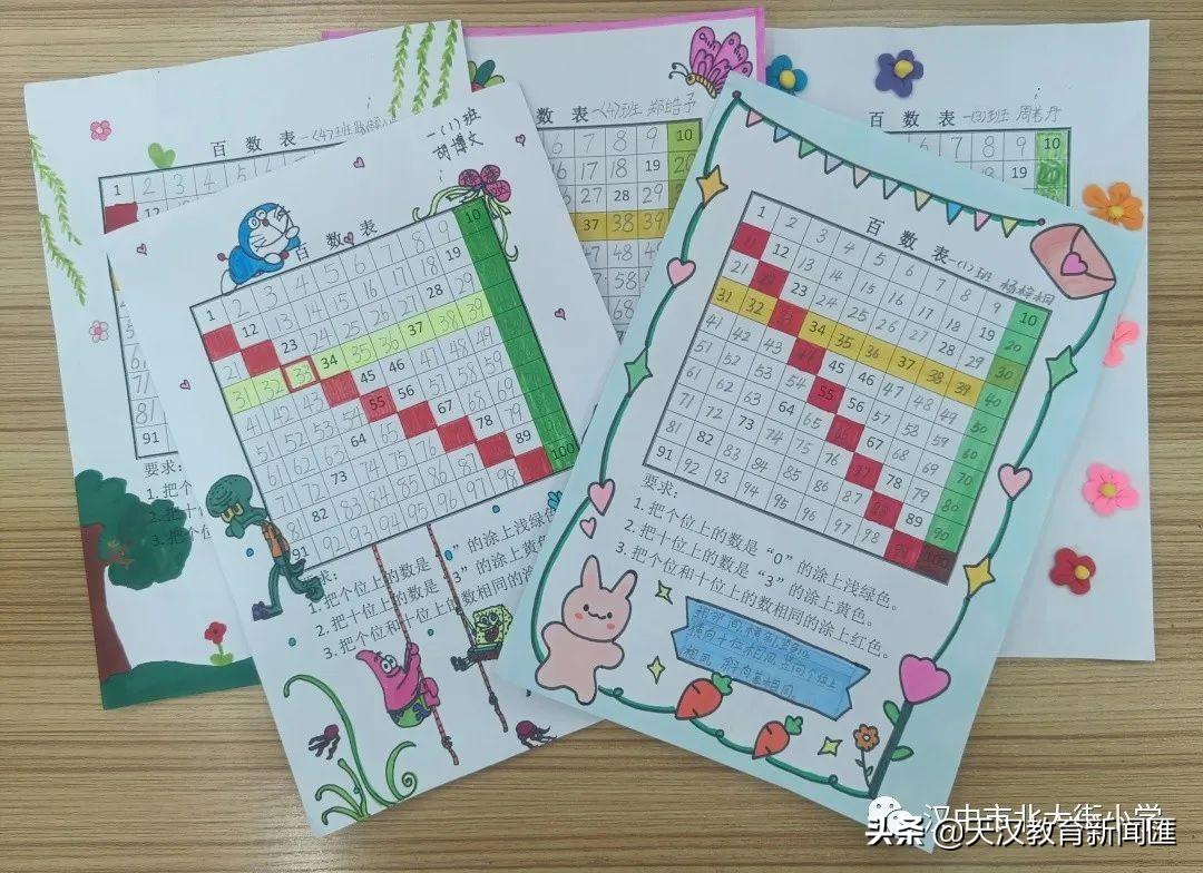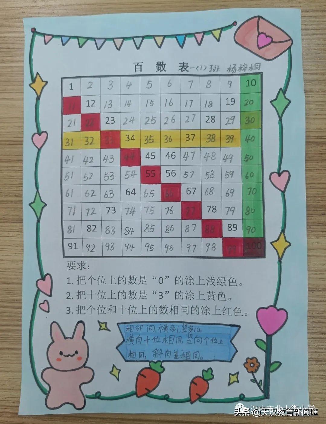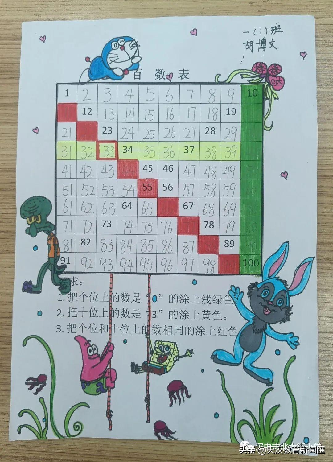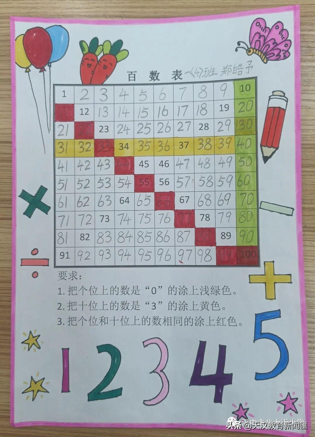 一年级组1,2,3…11,12,13…100……我们认识的数越来越多……只要我们有一双发现的眼睛,神奇的数世界就在我们身边。瞧,一年级学生做的百数表!