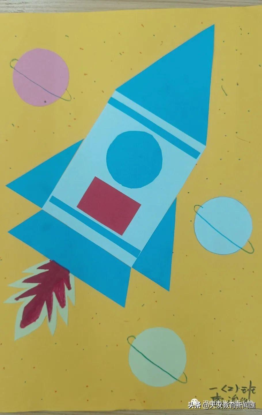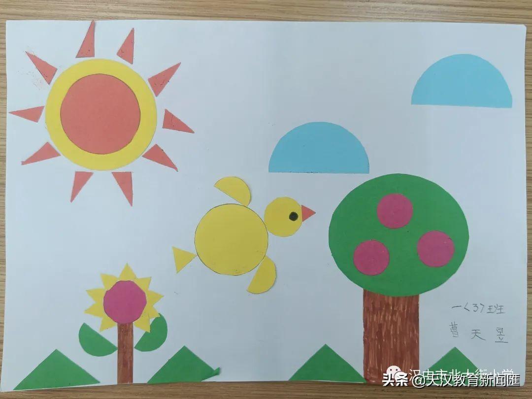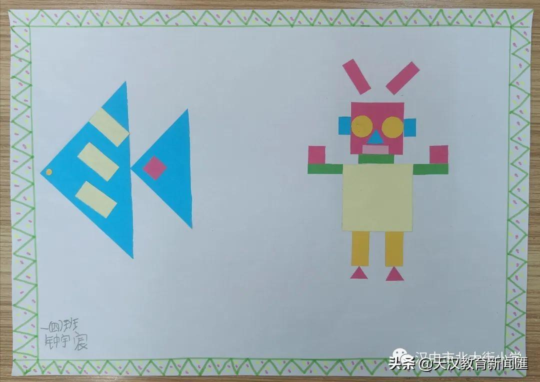 孩子们人小能量大,手脑并用把剪下来的图形根据自己的喜好重新组合,拼出美丽的图案, 并进行了边框装饰!