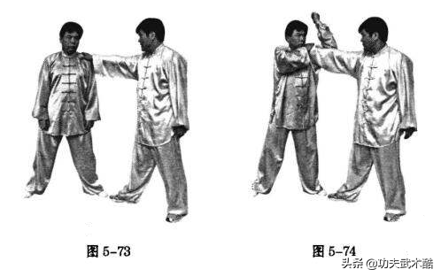 1、乙右手抓甲左肩头(图5-73):甲右手按扣于乙右手背上.左臂从乙右臂外侧上举(图5-74)。