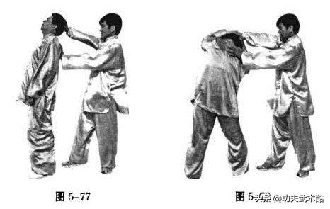 1、乙由甲身后用左手推甲后背,右手扒甲头部,向后拉甲头(图5-77)。甲两手叠按在乙右手背上向右后转身(图5-78)。
