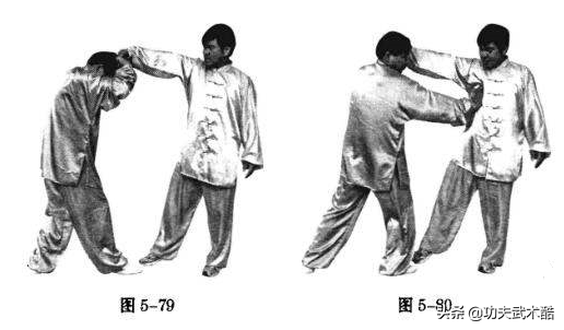 2、甲头向上顶.使乙腕折被控(图5-79),接着用掌推击乙胸部(图5-80)。