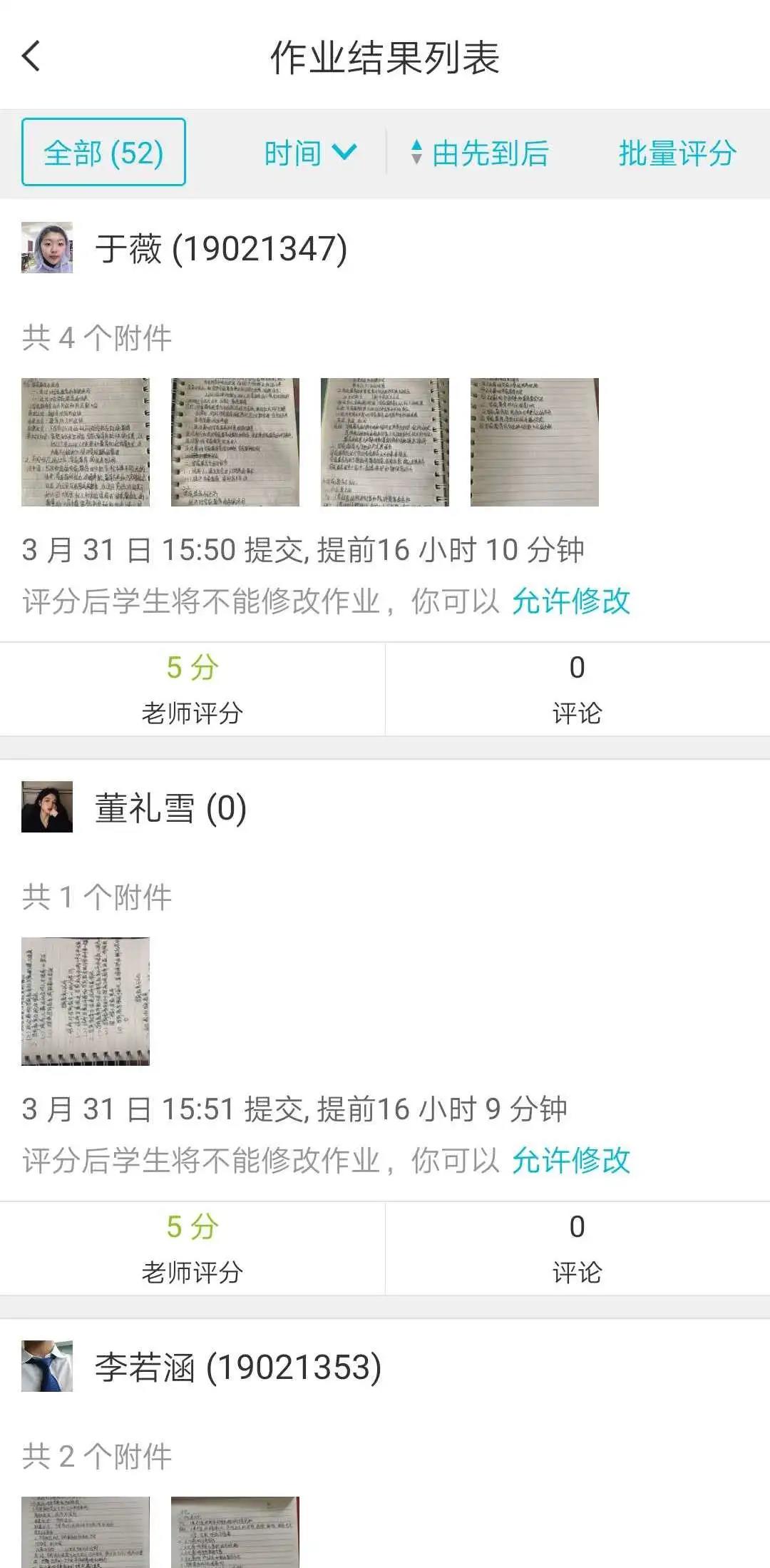 作业为开放式问题和提交课堂笔记相结合,学生根据要求上传文字和纸质版作业、教师按时批改。