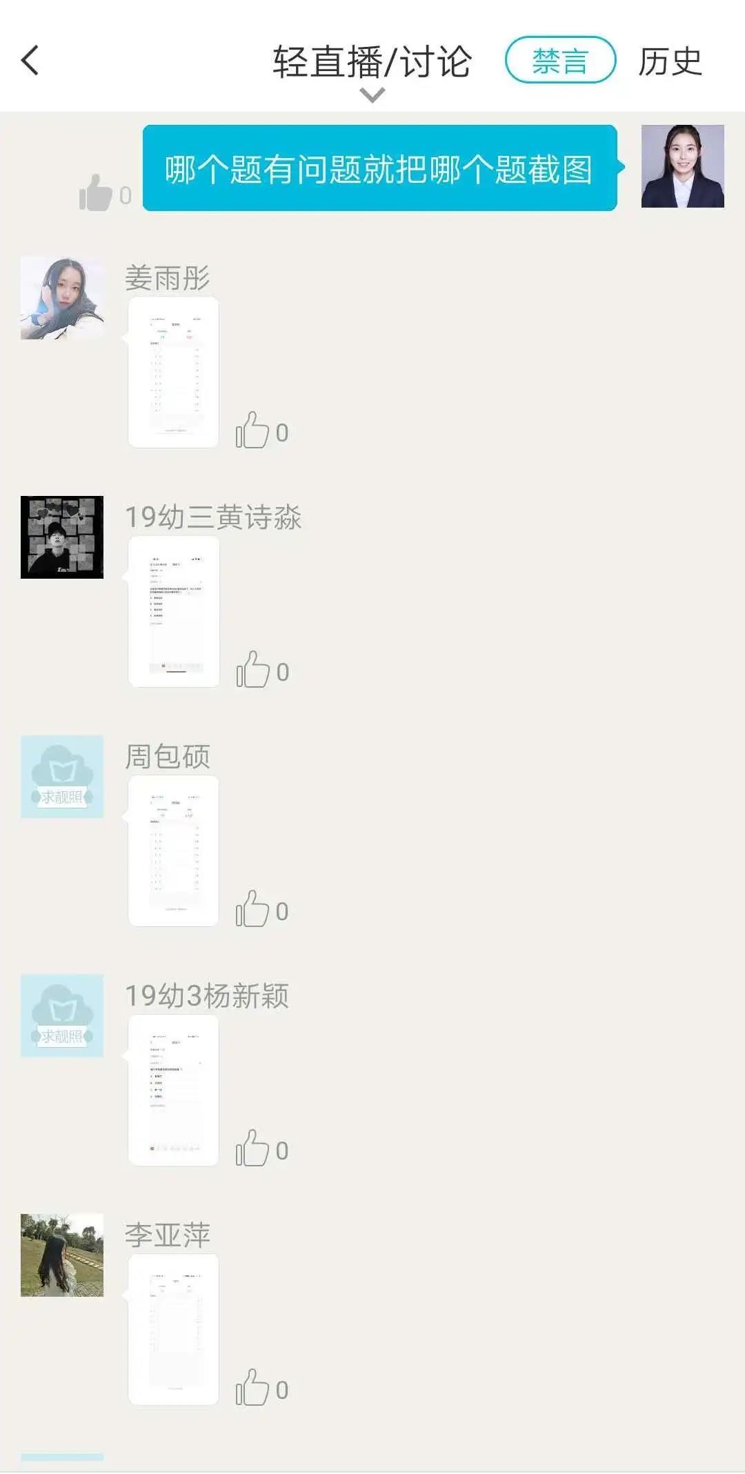 在云班课通知模块下发布本节课学习任务,组织学生签到并在签到结束后出示班级出勤情况,针对上一堂课小测试和作业情况在轻直播进行总结并将提前录屏好的错误率较高的测试题解析发给学生观看。