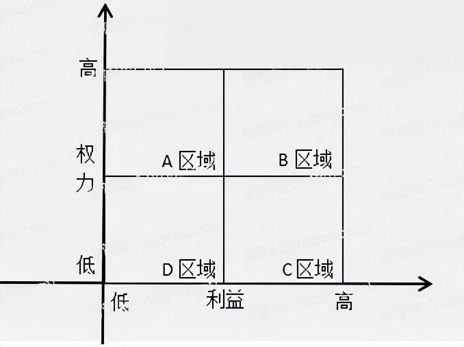 在下图的权力/利益矩阵中,针对(1)区域的干系人,项目经理应该“重点管理,及时报告”,采取有力的行动让其满意:针对(2)区域的干系人,项目经理应该“随时告知”项目状况,以维于以维持干系人的满意度:针对(3)区域的干系人,项目经理应该“令其满意”,争取支持;针对(4)区域的干系人,项目经理主要通过“花最少的精力来监督他们”即可。