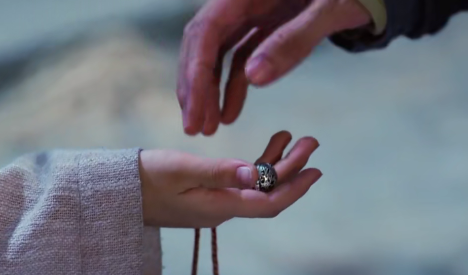 母女离开,童童回来把一直戴在身上的项链交给小白,感谢他的不杀之恩,说:“这是你的东西,还给你。”打开一看,原来,这是小白当时灭门的时候晕血磕掉的剑上的宝石。童童保留了这么久,现在终于物归原主了。