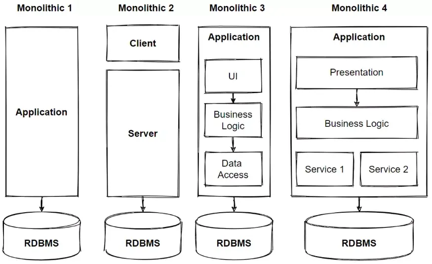 所有应用关注点都包含在一个大的部署中。即使是单体应用也可以设计出不同的层次,如表现层、业务层和数据层,然后将该代码库部署为单个 jar/war 文件。