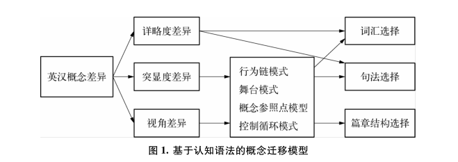 概念型教学法需要以概念迁移研究为基础。认知语法认为不同语言之间的概念差异主要体现为识解方式的差异。英汉语概念差异对中国学习者英语产出中遣词、造句和谋篇都可能会产生影响。详略度所体现的英汉概念差异主要是在词汇领域,特别是名词、动词和形容词,可能主要影响词汇和句法中的论元选择。英汉概念突显度的差异反映在一系列认知模式中,包括行为链模式、舞台模式、角色原型、概念参照点模式和控制循环模式等。英汉视角差异包括时间、空间、主体、正反等方面,在上述认知模型中也有所体现。突显度和视角对词汇、句法、语篇结构的选择都可能有影响。综上所述,汉语概念在学习者英语中的迁移可以用图1中的模型表示。