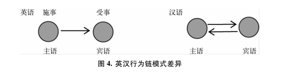 关于主语和宾语选择的文献很多,但往往把问题说得很复杂,使学生不得要领。我们通过图4向学生展示英汉行为链模式的差异,就可以让学生理解英语主语通常必须是施事,宾语必须是受事,从而在造句中避免汉语的干扰。