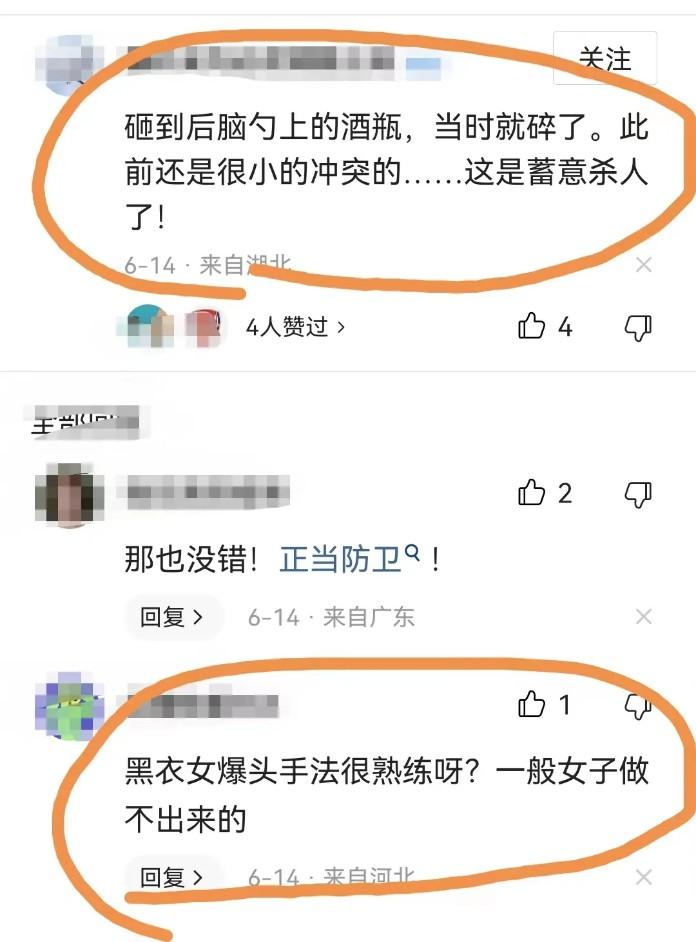 “黑衣女生的酒瓶砸到绿衣男头上,当时就碎了,此前白衣女和绿衣男的冲突还是很小的,黑衣女生这是蓄意杀人了。”
