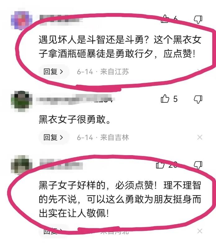 “太同情黑衣女生了,如此见义勇为还要被网暴。”