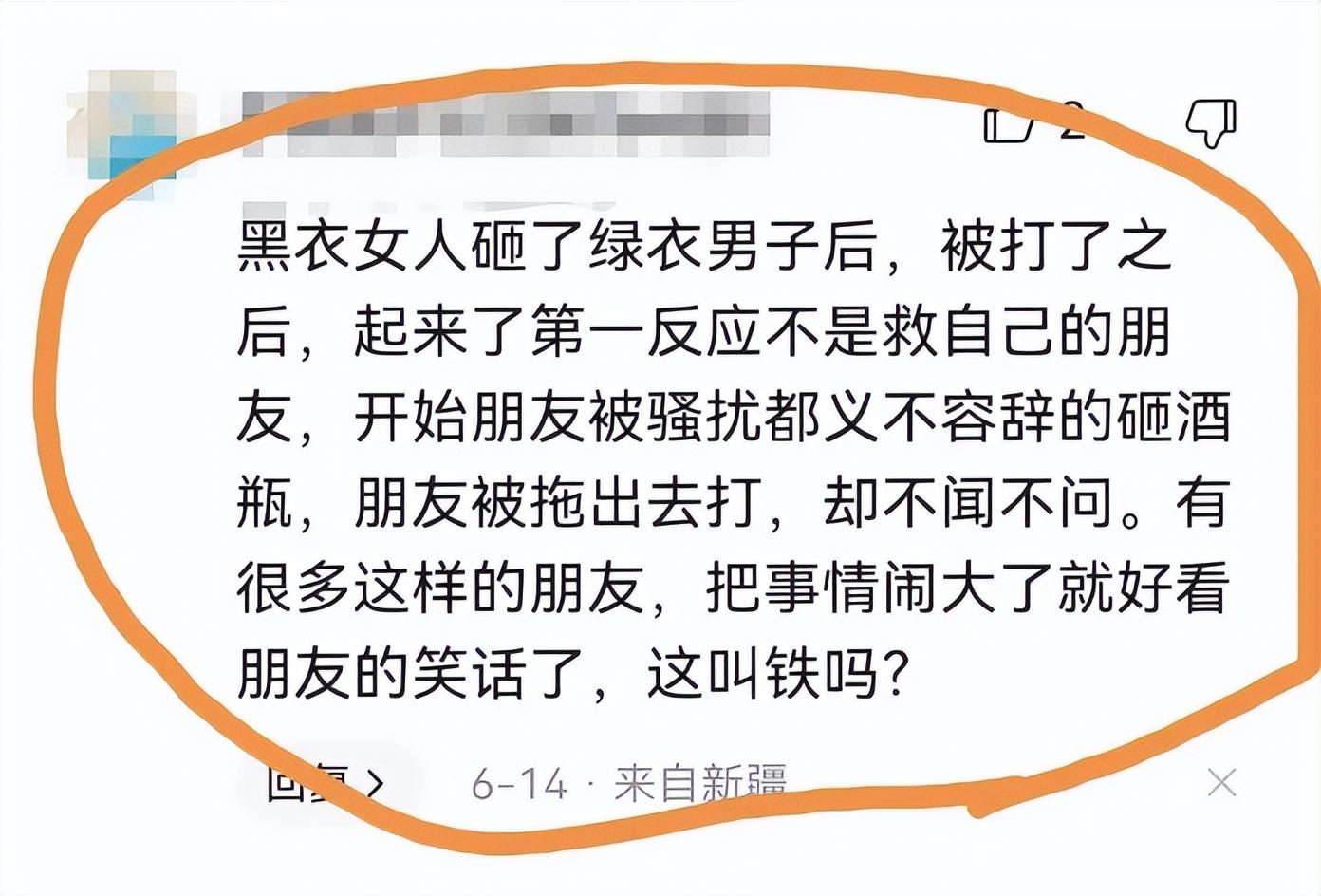 “黑衣女生砸了绿衣男子,被对方的人打倒爬起来之后,她的第一反应,不是去救自己的朋友,而是站在店内看着朋友被拖出去打,不闻不问。有这样的朋友吗,自己先把事情闹大了,然后再看朋友的笑话,这叫铁吗?”