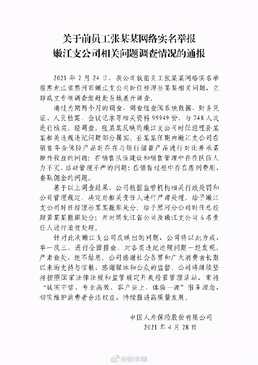 4.中国人寿公布前员工举报调查结果:28日,中国人寿公布公司前员工张某某网络实名举报黑龙江省嫩江支公司时任经理孙某某相关问题的调查通报。通报显示,张某某举报部分属实。基于调查结果,中国人寿给予孙某某撤职处分,给予黑河分公司时任总经理黄某某撤职处分,并对黑龙江省公司及嫩江支公司6名责任人进行追责处理。针对举报反映的基层支公司经营管理中出现的问题,中国人寿将进行全面排查,对各类违纪违规问题一经发现,严肃查处,绝不姑息。(新华网)