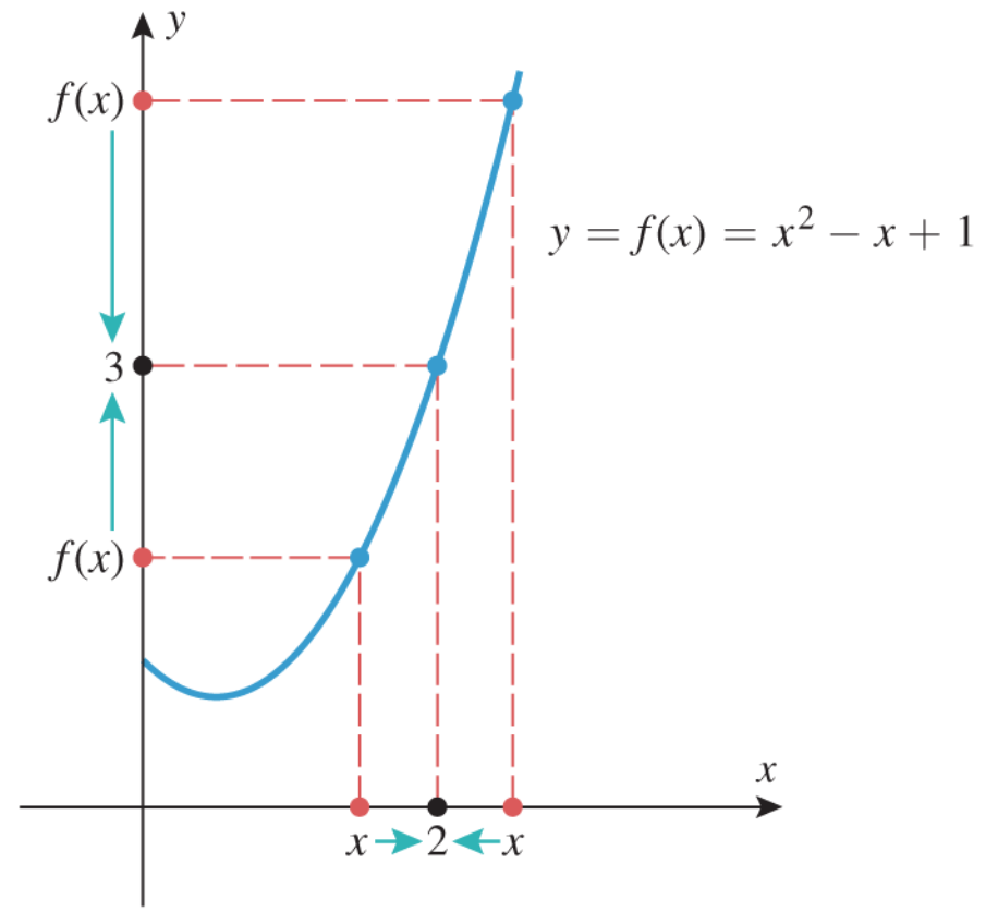比如上面那个图可以清晰的看出来当x无限向2靠近的时候,y值就无限的向3靠近,于是我们就说x趋近于2时函数的极限是3。