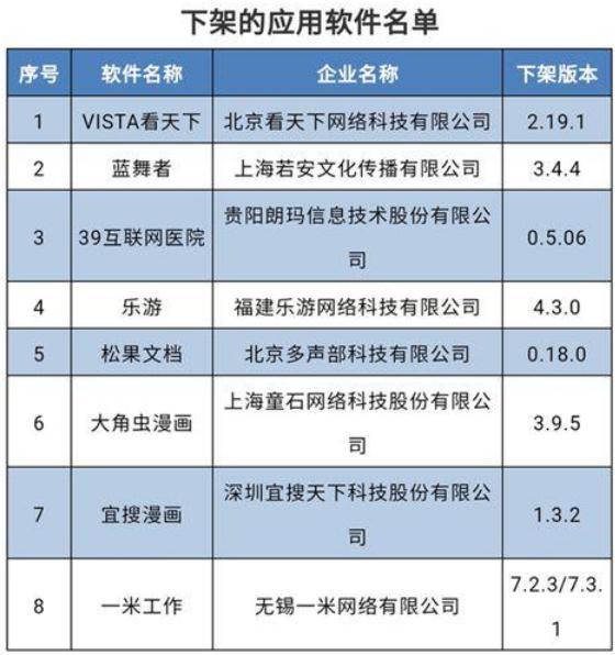 8月19日,工信部官方公号发布对包括VISTA看天下、大角虫漫画等在内的8款APP进行下架处理。此次下架的APP为未在工信部规定整改期限内完成整改,依法进行下架。涉及的问题如大角虫漫画存在强制用户使用定向推送功能、账号注销难、私自共享给第三方问题;松果文档存在私自收集个人信息、私自共享给第三方、不给权限不让用问题;