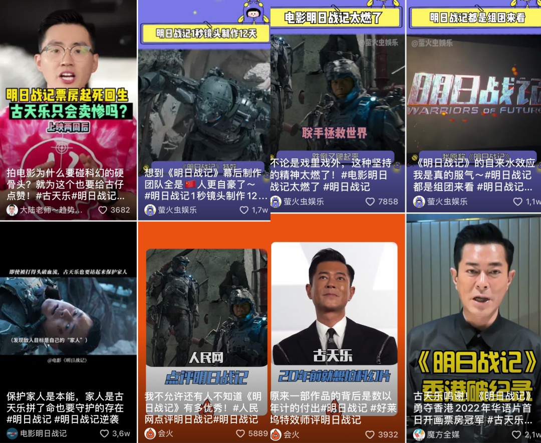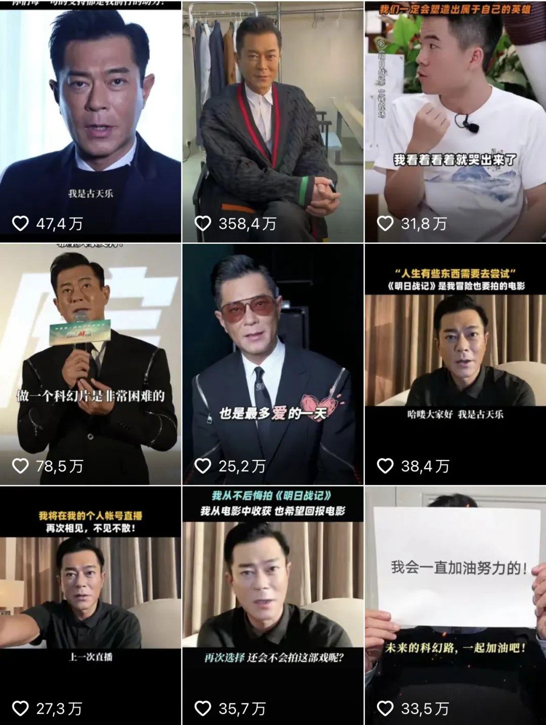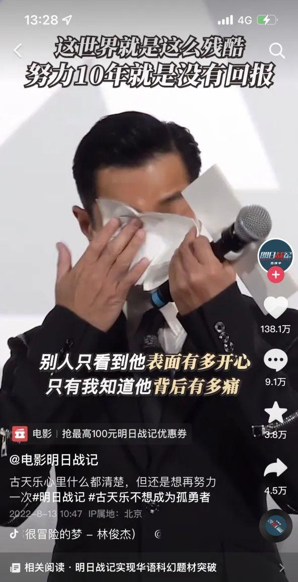 《明日战记》的“卖惨”策略,其实也是重情绪的分支之一,本质上利用的是观众对古天乐等最后一批港台明星的一种情怀,因此在抖音更有土壤。除了“卖惨”之外,“爱国”“失恋”“亲情”等等,都是常见的情绪抓手。