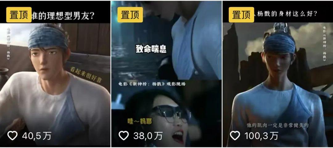 以近期热映的《新神榜:杨戬》为例,其官方抖音的物料主打的营销点,从“沉香和杨戬的甥舅情谊”到“国产神话故事值得一直讲”再到“一个特效镜头付出了多少努力”最后到“主角颜值好高”的一系列变化过程。在这个过程中,营销逐渐找到了最受用户欢迎的点——官抖置顶的三条视频,也是点赞数最高的三条视频,都是以“杨戬长得好帅”为主题的。