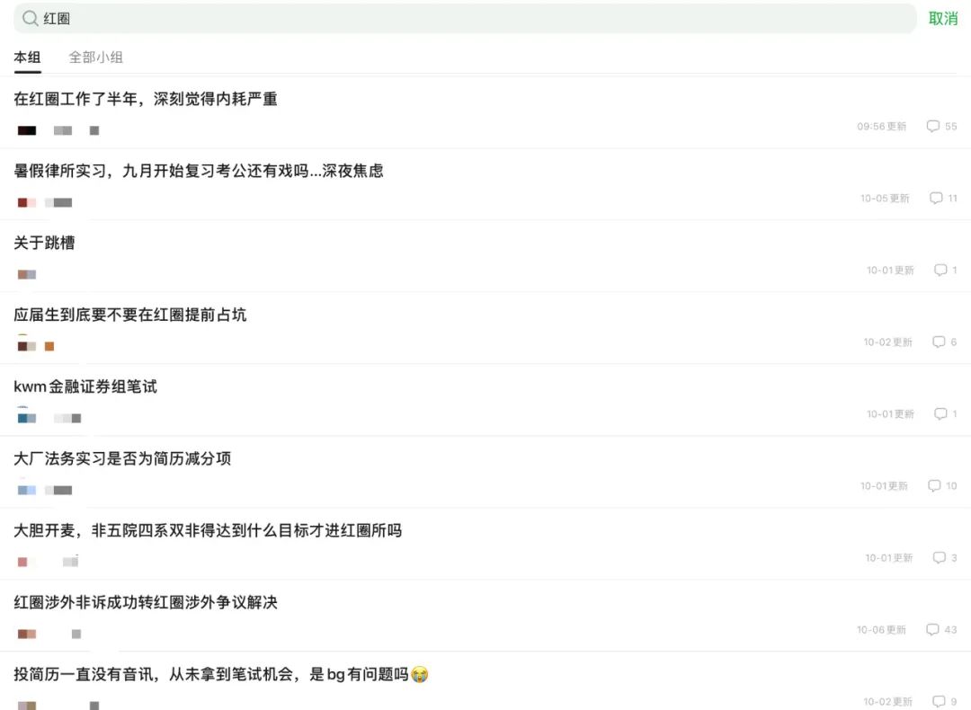 截至2022年10月9日,在豆瓣Women in Law女性律师互助组检索“红圈”共有1200条结果