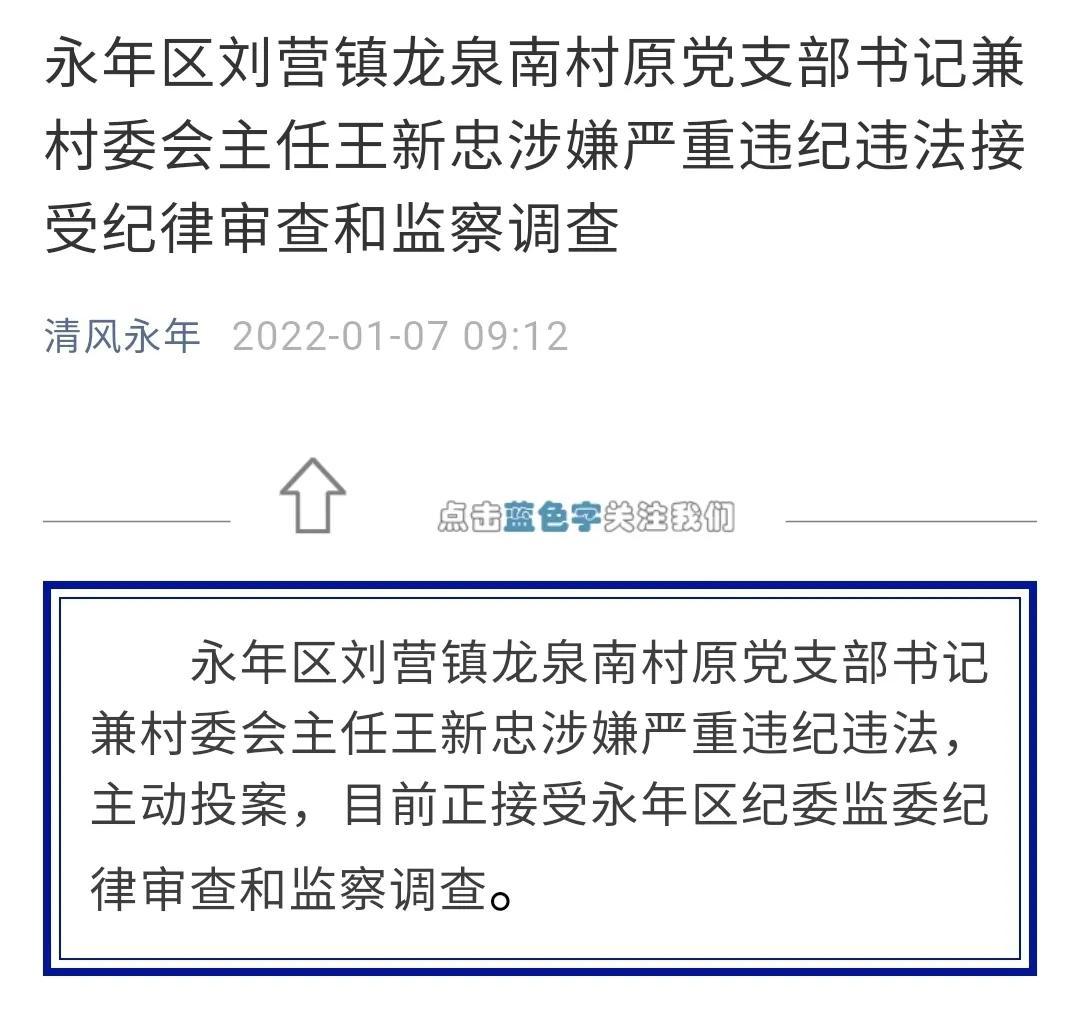 永年区刘营镇龙泉南村原党支部书记兼村委会主任王新忠涉嫌严重违纪违法,主动投案,目前正接受永年区纪委监委纪律审查和监察调查。