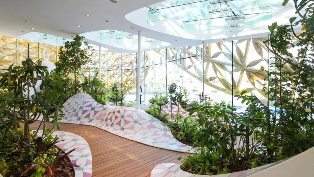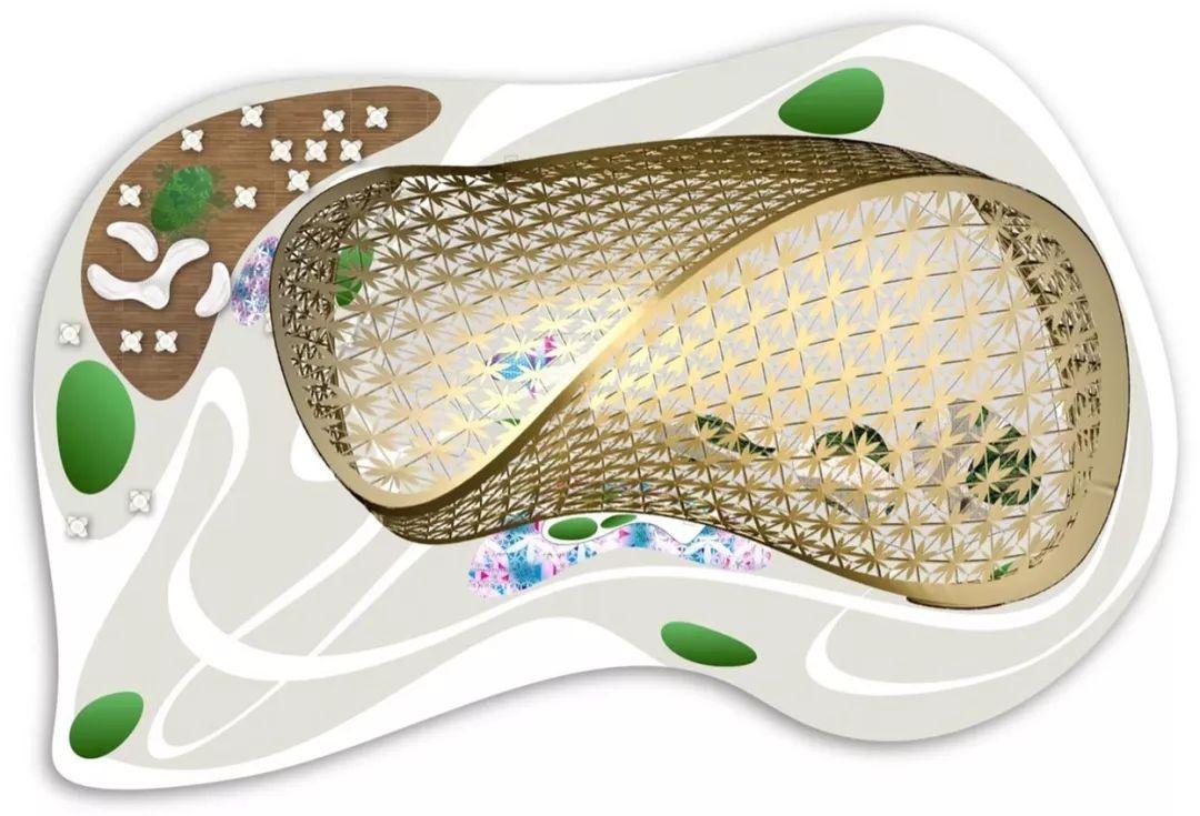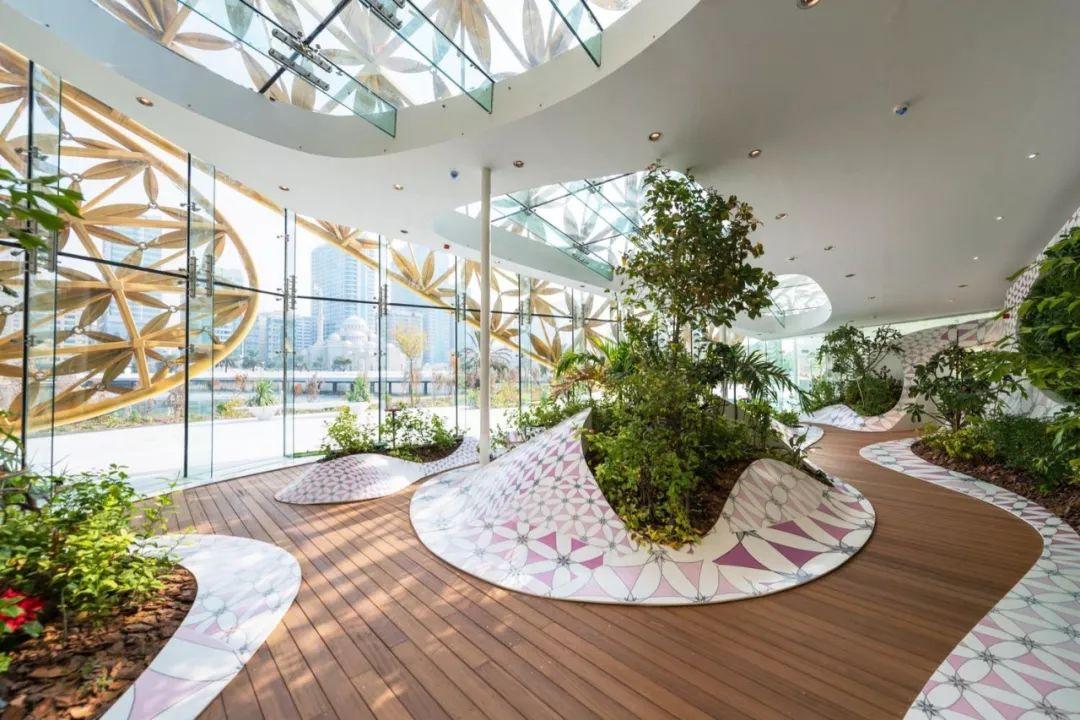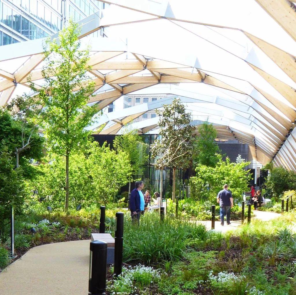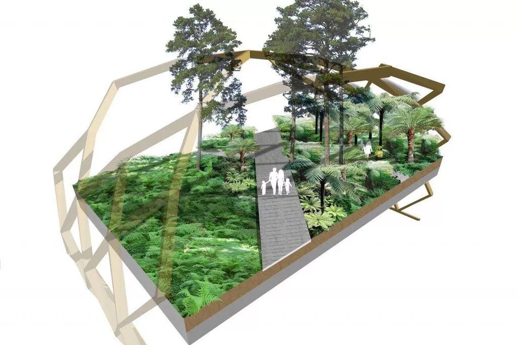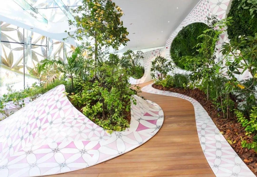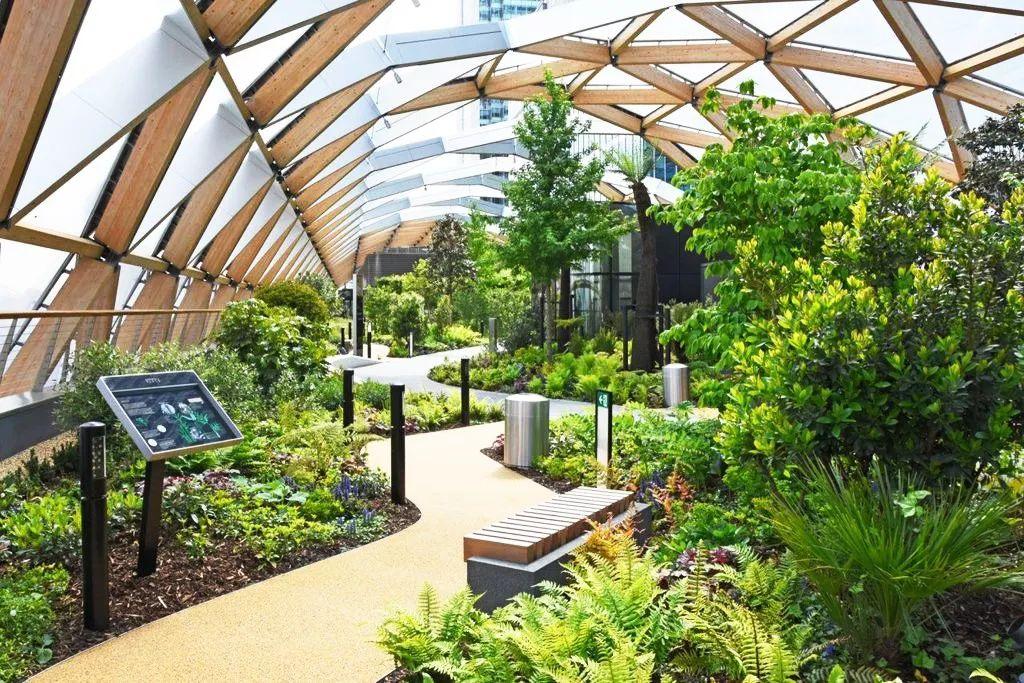 屋顶花园的设计是为了唤醒一艘满载着来自世界各地的不同寻常和异国风情的标本的船,它被包裹在一个复杂的ETFE格子木屋顶结构中,由Foster+Partners设计,屋顶结构像一个开有开口的贝壳一样包裹在建筑物周围,让光渗透和自然灌溉。半透性冠层结构有助于创造局部小气候,从而可以种植更敏感和稀有物种的植物。