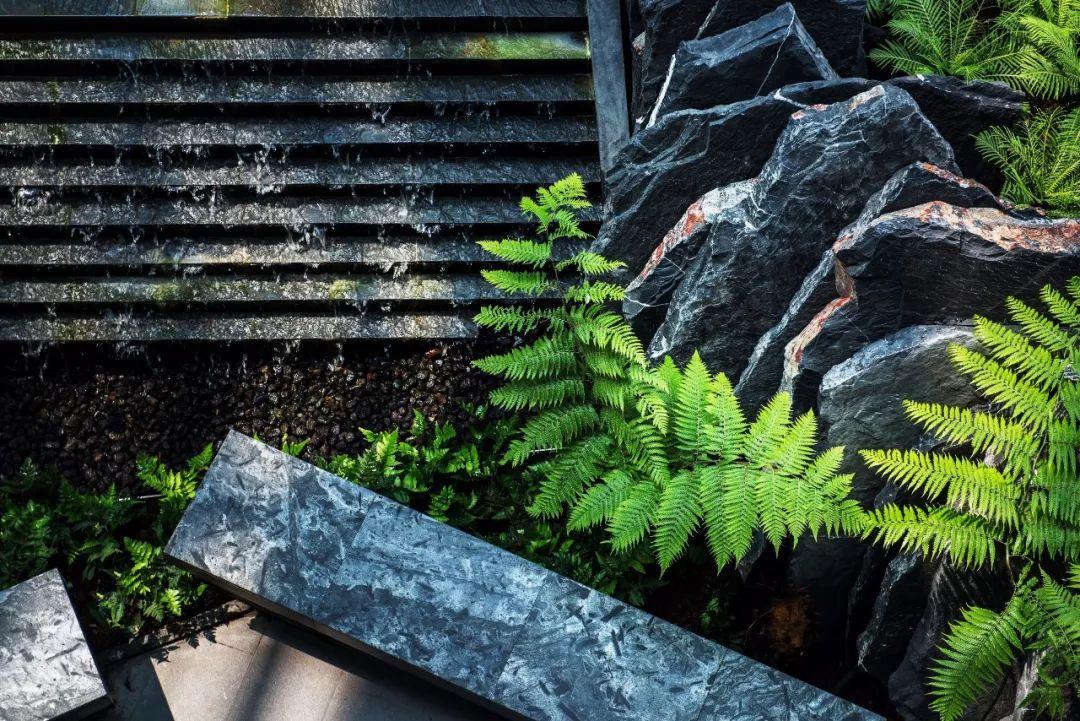 水景采用商场的冷却系统,通过冷水管道的热交换进入建筑物的冷却系统。随着不断变化的曲折流动,涟漪和瀑布的物理形态,每个弯道都会提供独特形式的水溅和蒸发冷却效果,沿着景观中的各种特征流动。此外,隐藏的喷气扇创造出一种轻柔的气流,散发来自水景表面的凉爽水分。