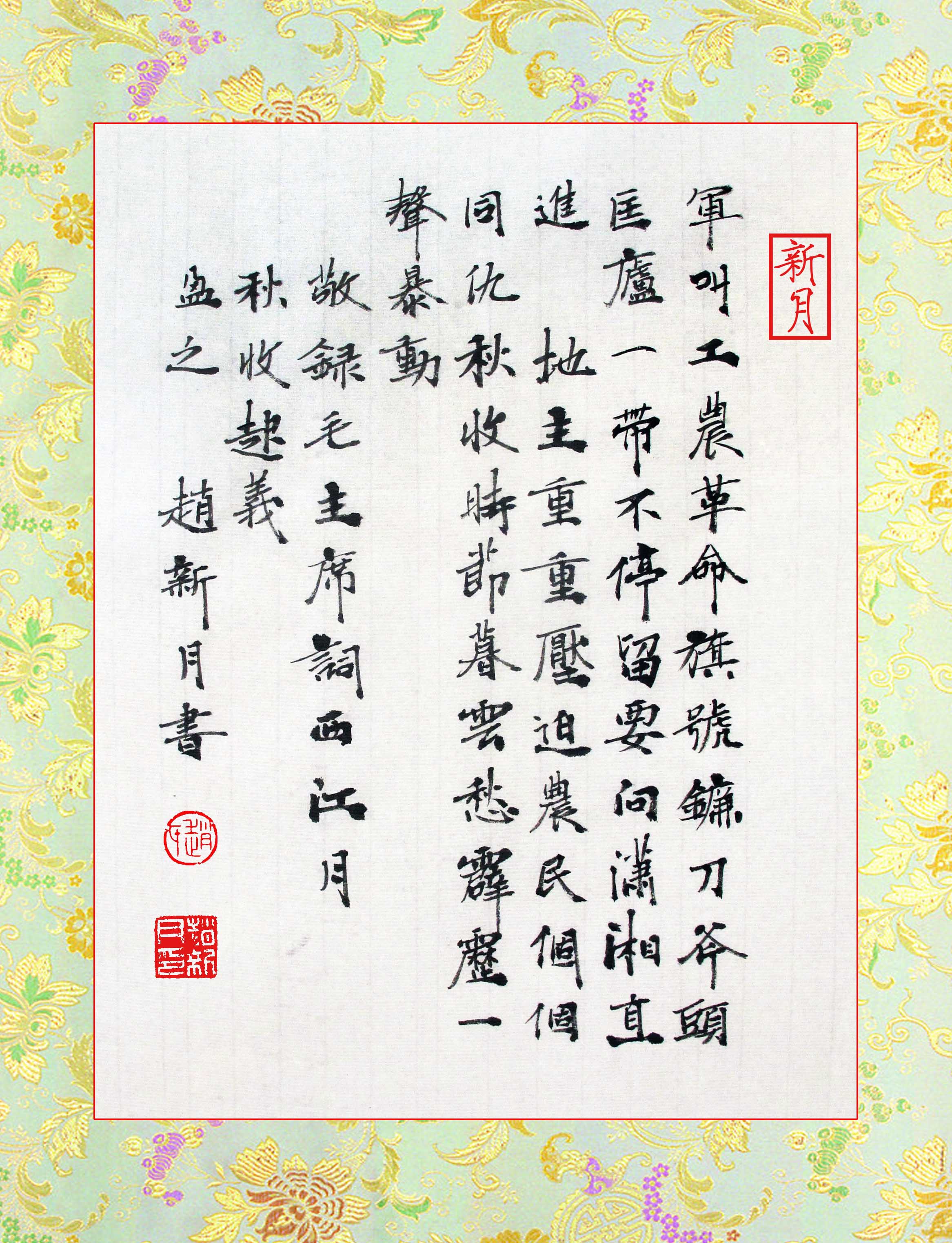 (赵新月,一介书生,理论工作者,中共党员,河北作协会员、美协会员、书协会员,党史研究专家,西柏坡学创立者,特型演员,广播节目主持人,专栏作家。主要著作:《西柏坡来电》、《你来西柏坡看什么》、《大西柏坡赋》、《开国第一城》、《西柏坡学发凡》、《画家书法八大家》、《悯生论——主持人书简》等,主演《赶考》、《亲情毛泽东》、《平津战役》等影视剧舞台剧,主要研究方向:文史哲经艺)赵新月记于野草书屋。